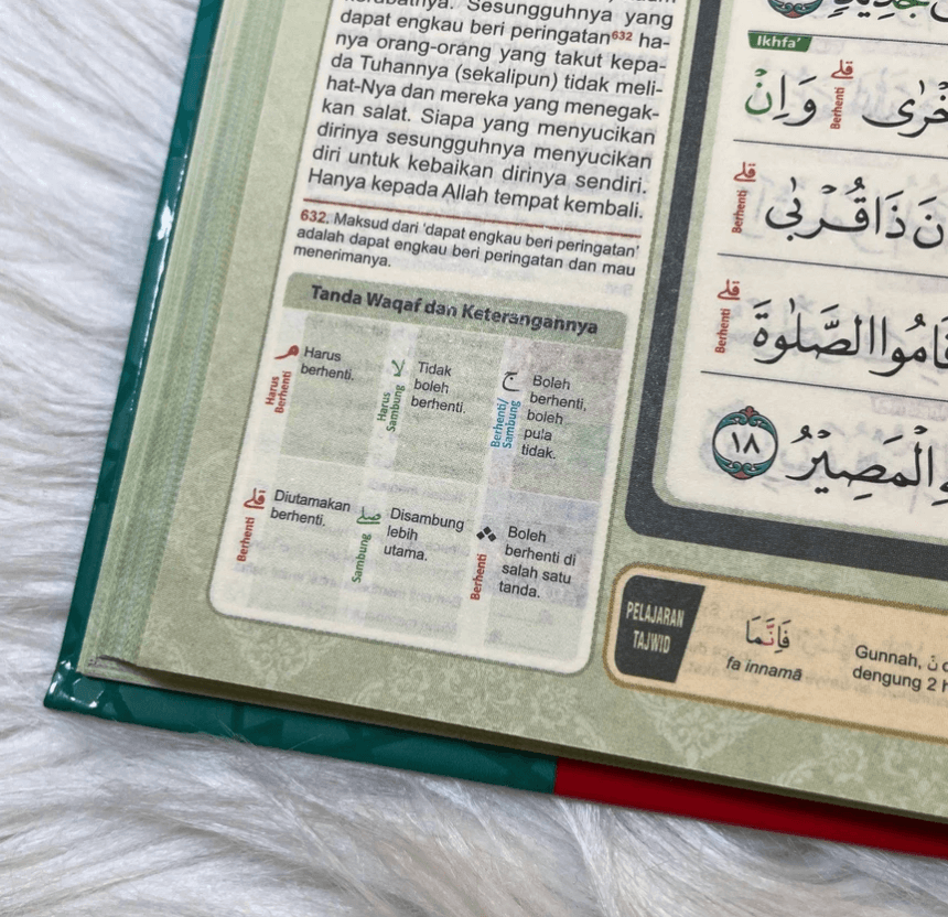 - Kertas QPP (Quran Paper Premium): Kertas khusus yang menyerap cahaya (matte), adem di mata, tidak silau meski di bawah lampu terang.